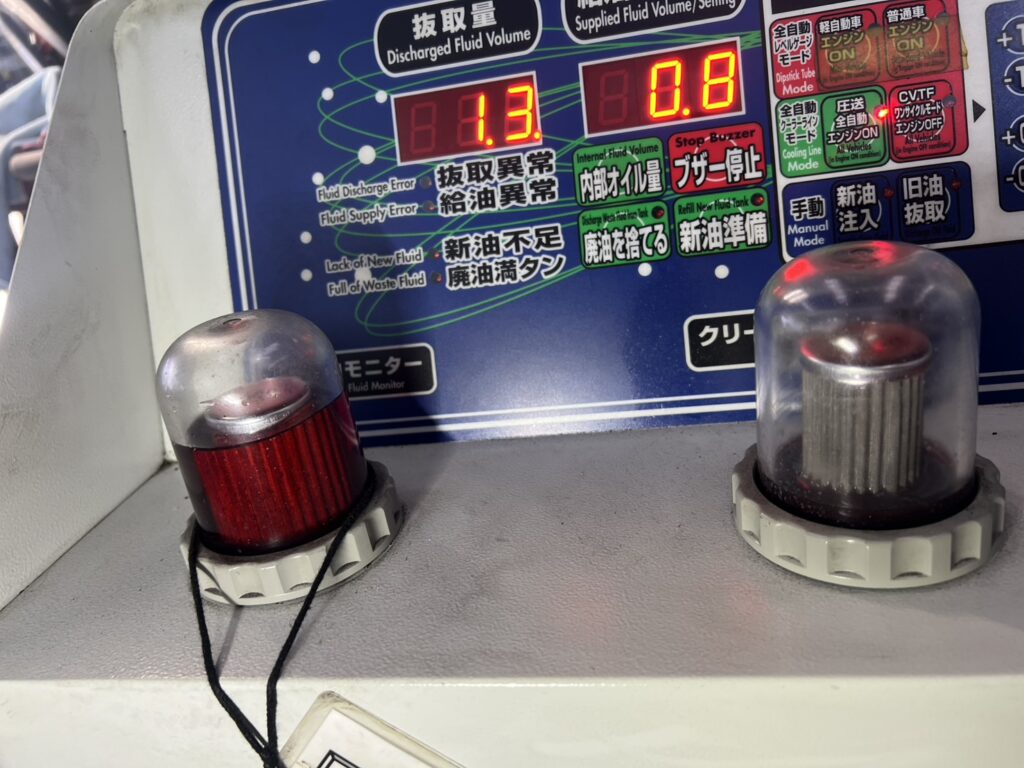 そして廃油を抜きながら新しいオイルを入れていき、設定量の交換が終了後10分間の