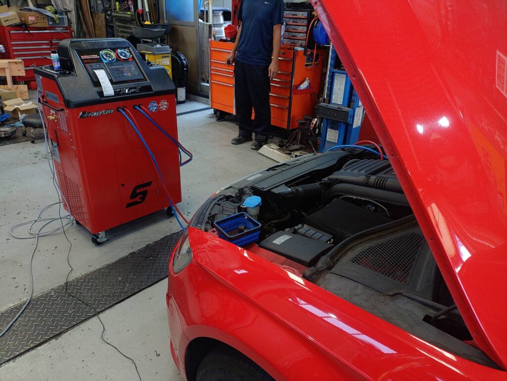 システム内のクリーニングをして車両データにもとずいたg単位での充填が可能となりエアコンの能力が回復します